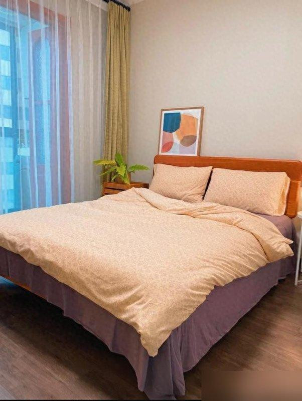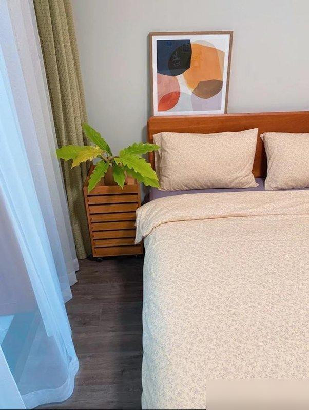 卧室没有复杂背景墙一面奶油色墙漆配木饰面省钱又出效果;