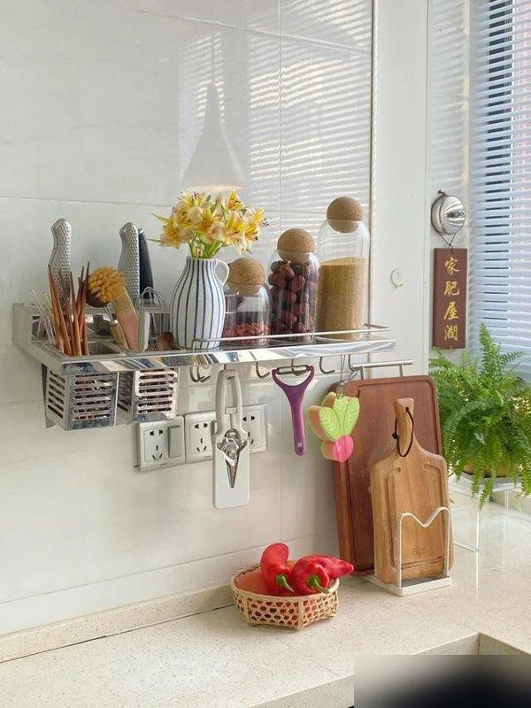 灶台旁挂一根磁条刀架,刀具排排站省出台面一大块空地,随手拔刀不带磕碰声。