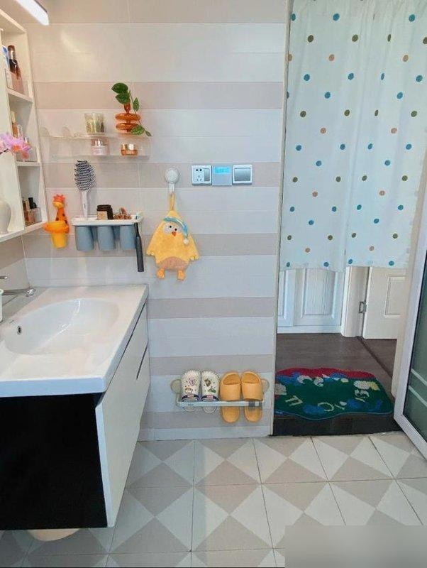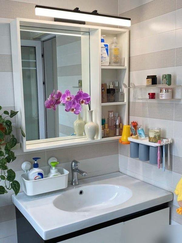 悬空浴室柜离地二十公分扫地机器人钻进去溜达一圈毛发灰尘打包带走留下清爽脚印子。