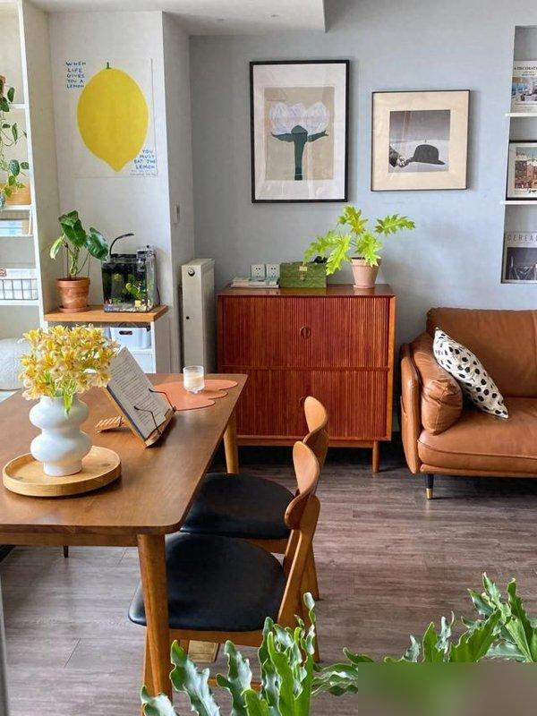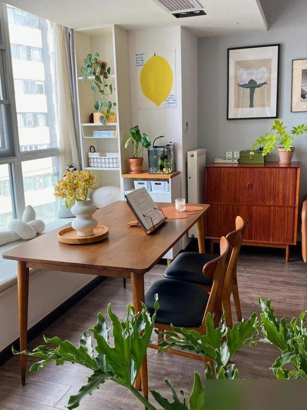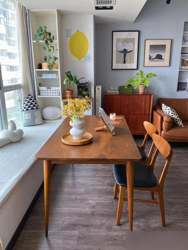 客厅和餐厅打通后光线直接灌进来原木桌挨着落地窗孩子吃饭顺便数楼下有几只麻雀;